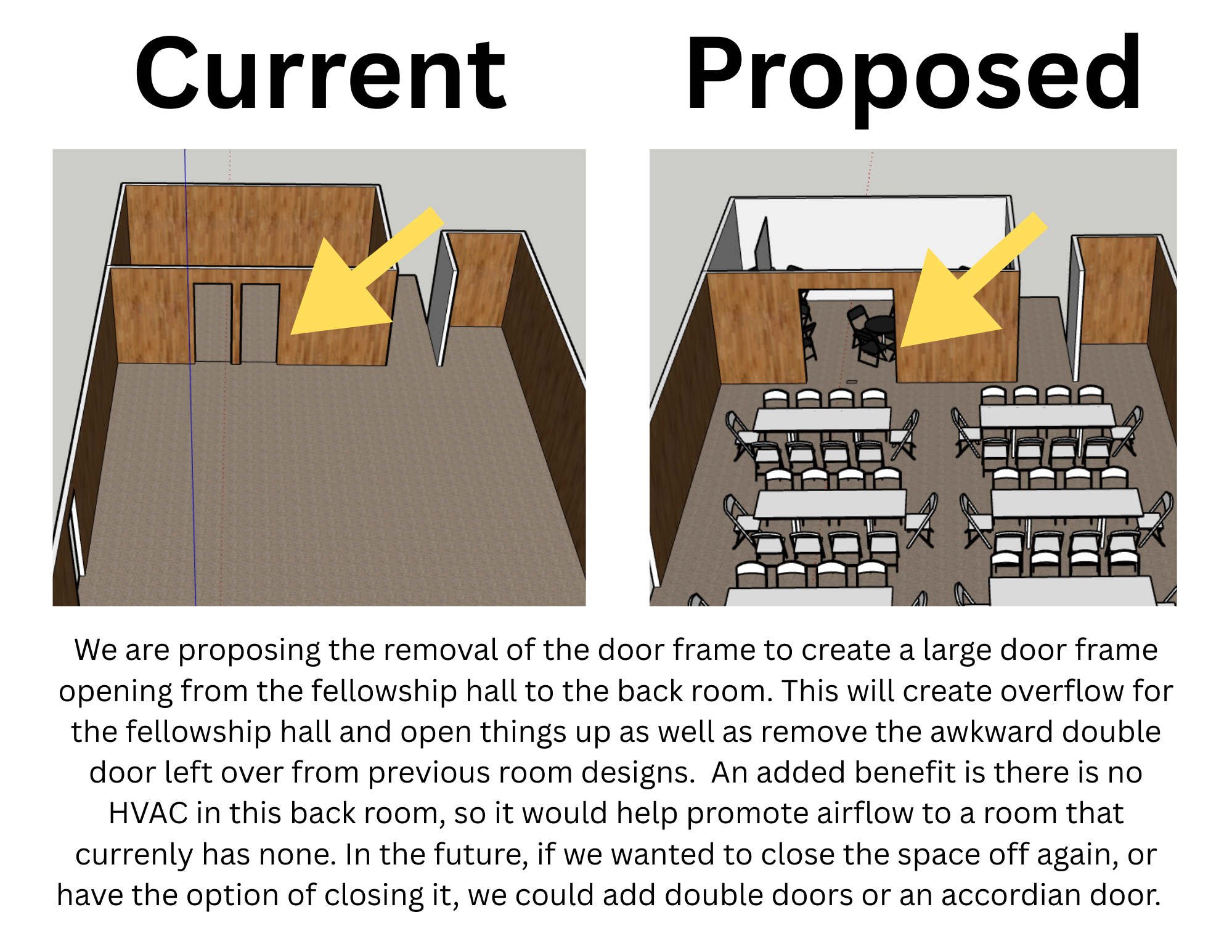 We are proposing removing the center post between the two single doors that connect the fellowship hall to the back room. This will create a large open doorway between the spaces.